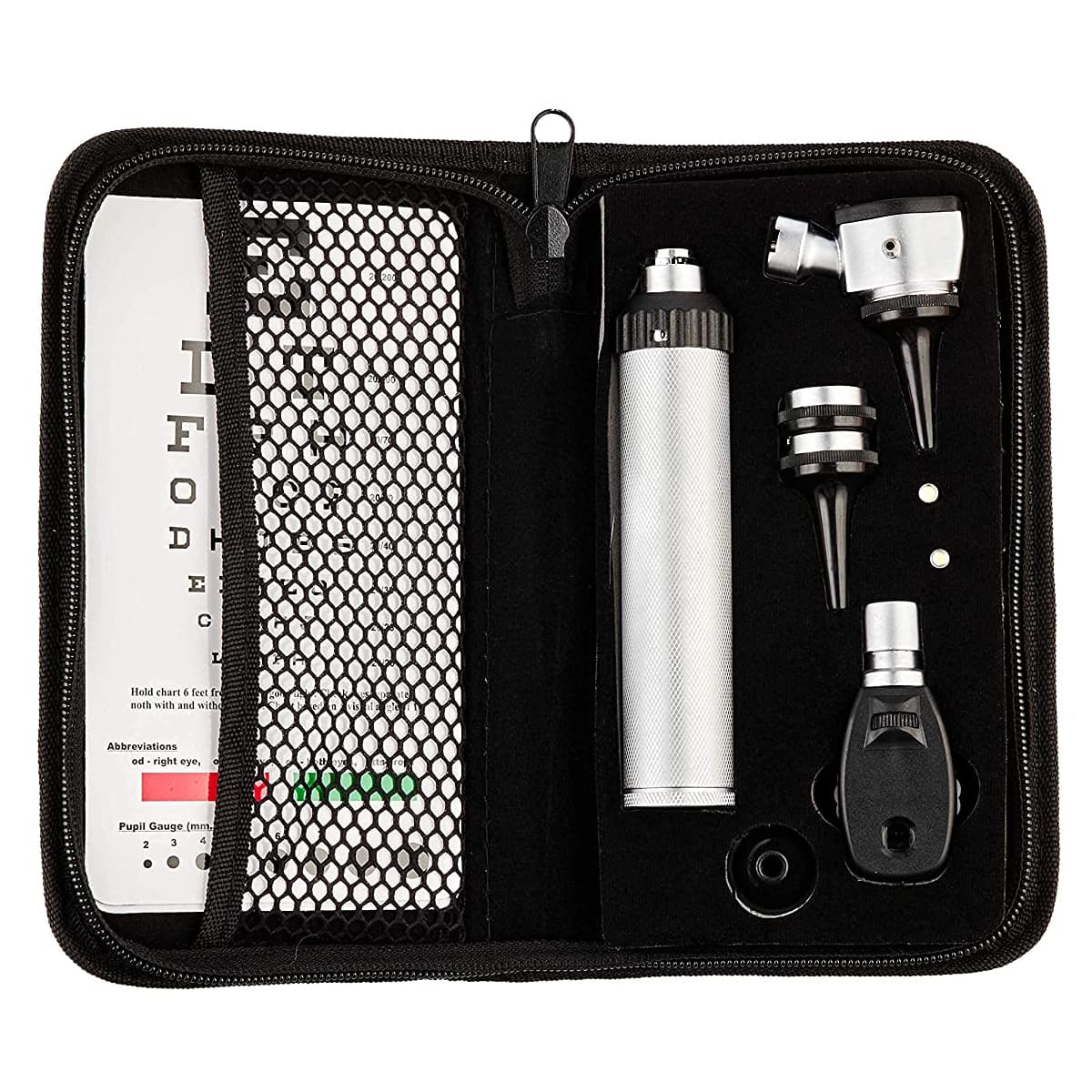 This set typically includes a fiber optic otoscope, ophthalmoscope, nasal speculum, tongue depressor handle, and various diagnostic accessories depending on the model. Each instrument is crafted from durable medical-grade materials to ensure long-lasting performance in both hospital and clinical environments.