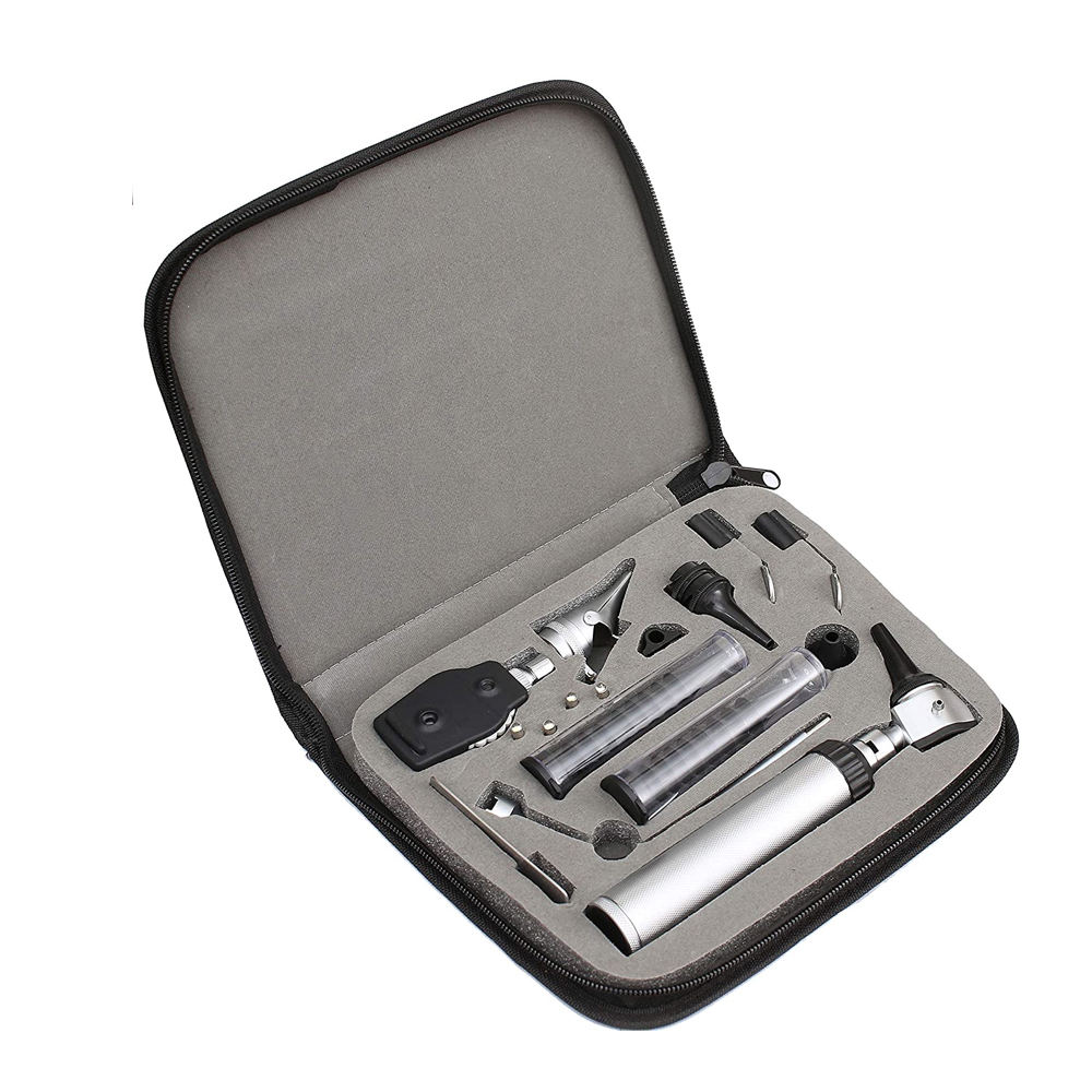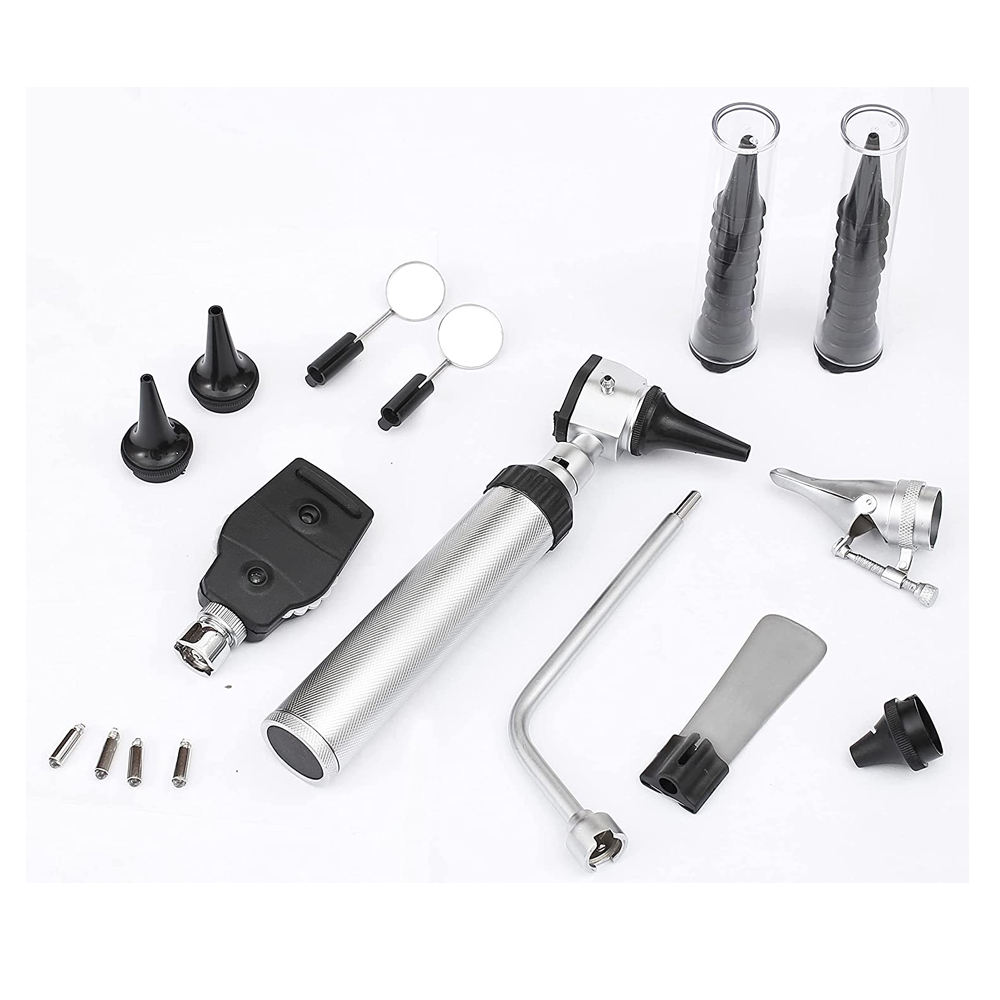 This set typically includes a fiber optic otoscope, ophthalmoscope, nasal speculum, tongue depressor handle, and various diagnostic accessories depending on the model. Each instrument is crafted from durable medical-grade materials to ensure long-lasting performance in both hospital and clinical environments.